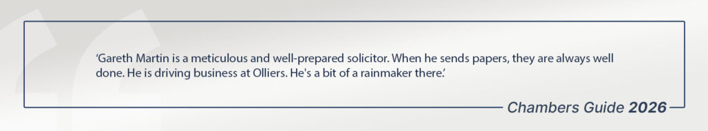 Gareth is focused on ensuring that the team at Olliers are amongst the go-to lawyers for all regulatory matters including health and safety, inquests and public inquiries, licensing (firearms appeals, in particular) and professional discipline matters.